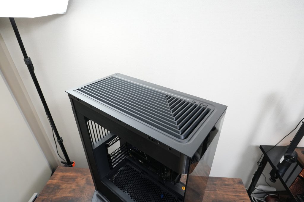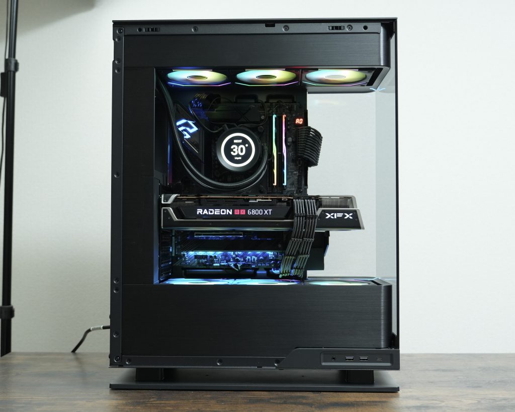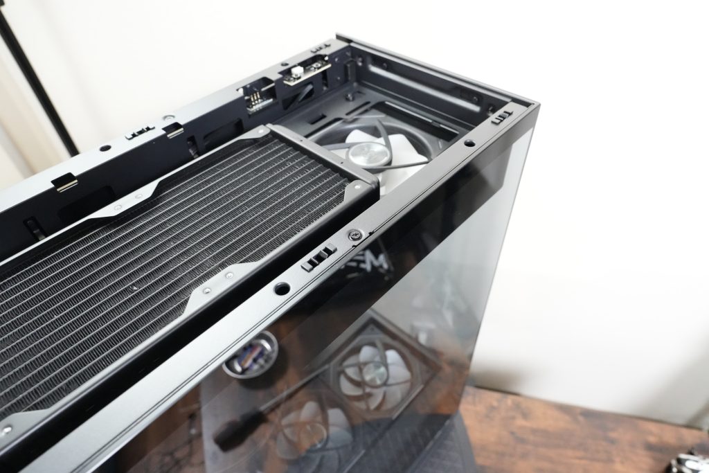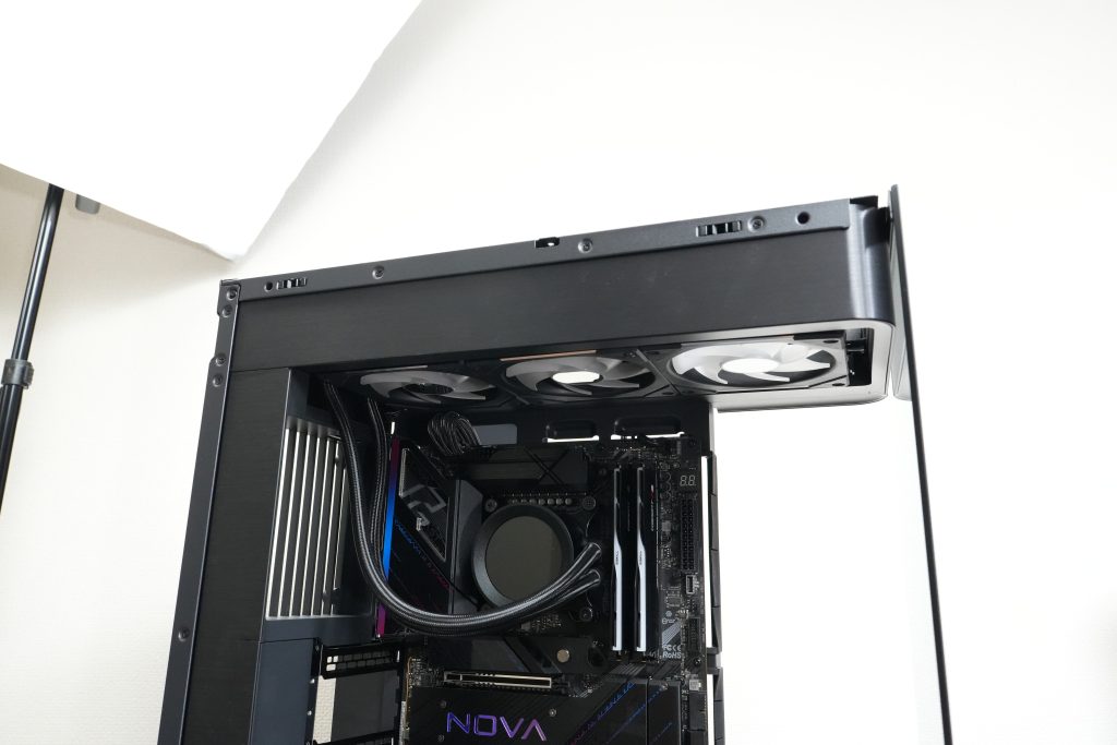 なので、このケースを使うと簡易水冷を使ってファンを3枚づつ搭載して組みつけてね!という皆んな同じようなテンプレ構成以外の選択肢がほぼ無いという感じになります。