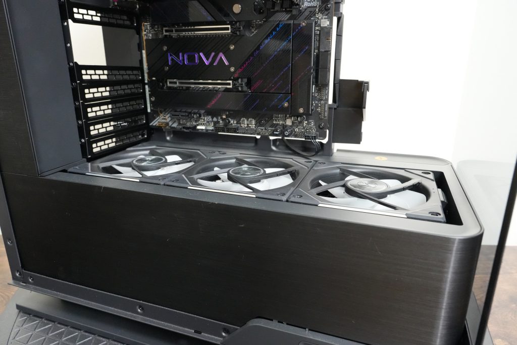 トップには360mm簡易水冷(画像は240mm)、ボトムには120mmファンが3枚(ラジエータは搭載不可)搭載可能です。140mmファンの搭載は出来ません。
